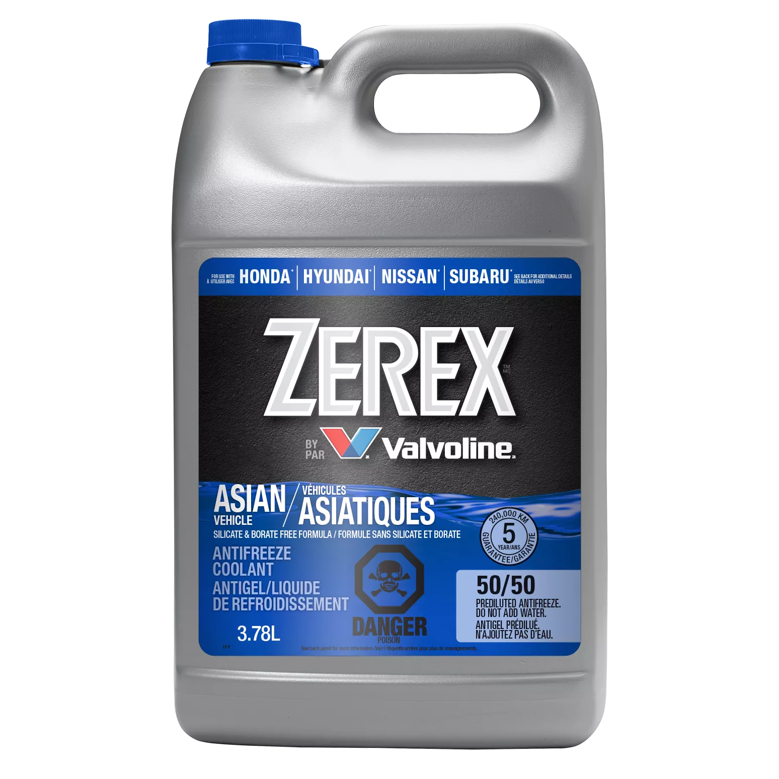 ZEREX™ Asian Vehicle Antifreeze/Coolant is specifically formulated to meet the requirements of Asian vehicle manufacturers (Honda®, Nissan®, KIA®, Hyundai® and others) requiring a blue, silicate free Hybrid Organic Acid Technology (HOAT) with a phosphate additive. This patented formula is designed to replace the original fluid and provides protection from rust, corrosion, boil overs and freezing.