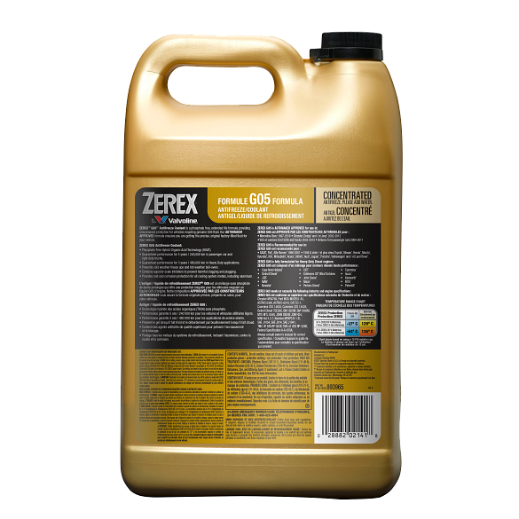 ZEREX™ G-05® is the automaker approved original chemistry used in newer Ford, Chrysler and Mercedes-Benz automotive and diesel engines. Its Hybrid Organic Acid Technology (HOAT) chemistry combines the best of conventional and organic acid-based chemistry to provide the ultimate protection against rust and corrosion. ZEREX G-05 antifreeze/coolant uses the highest quality virgin ethylene glycol for freeze and boilover protection and a hybrid organic acid corrosion inhibitor package to protect your engines from liner pitting and corrosion.